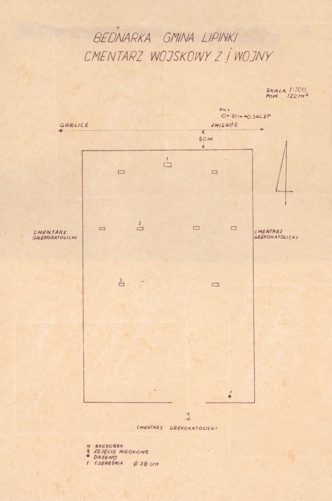 Zaprojektowany przez Hansa Mayera cmentarz położony jest na lekkim wzniesieniu po prawej stronie drogi nr 993 jadąc od strony Gorlic. Stanowi on kwaterę wojskową na cmentarzu parafialnym w Bednarce. Założony został na planie prostokąta, ogrodzony jest niskimi kamiennymi słupkami połączonymi ze sobą podwójnymi poręczami z żelaznych rur. Wejście na cmentarz prowadzi przez drewnianą furtkę, która znajduje się naprzeciwko pomnika centralnego (pierwotnie był to wysoki drewniany krzyż z półkolistym, blaszanym nakryciem profilowanym na obrzeżu. Na chwilę obecną funkcję pomnika centralnego pełni betonowy nagrobek z dużym żelaznym krzyżem jednoramiennym, ażurowy, z motywem palmety ma drzewcu). Dzisiejszy wygląd cmentarza odbiega od wyglądu pierwotnego, możemy to przypisać pracom remontowym które przeprowadzono w okresie międzywojennym. W 7 grobach zbiorowych i 4 pojedynczych pochowano 27 żołnierzy (w tym 14 rosyjskich) poległych w maju 1915 roku podczas przełamywania pozycji głównego pasa obrony rosyjskiej.