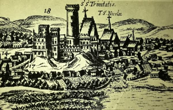 Widok zamku w Lublinie na początku XVII w. Fragment sztuchu z Brauna i Hogenberga, Civitates orbis terrarum. "Zamki w Polsce" Bohdan Guerquin. Warszawa 1974. Str. 185